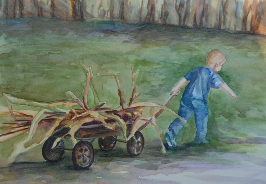 Okay, I really need to put this painting to rest. This will be my last post of this painting, unless I do something groundbreaking to it. I made the necessary adjustments to my son's shirt and darkened the background behind him....although I'm not completely happy with the results. Also, I've decided the cornstalks are a bit broken up around the edges on the wagon. I've tried to clean them up, but I just haven't mastered negative shape washes. I'm not too pleased about the corn field in the background either.